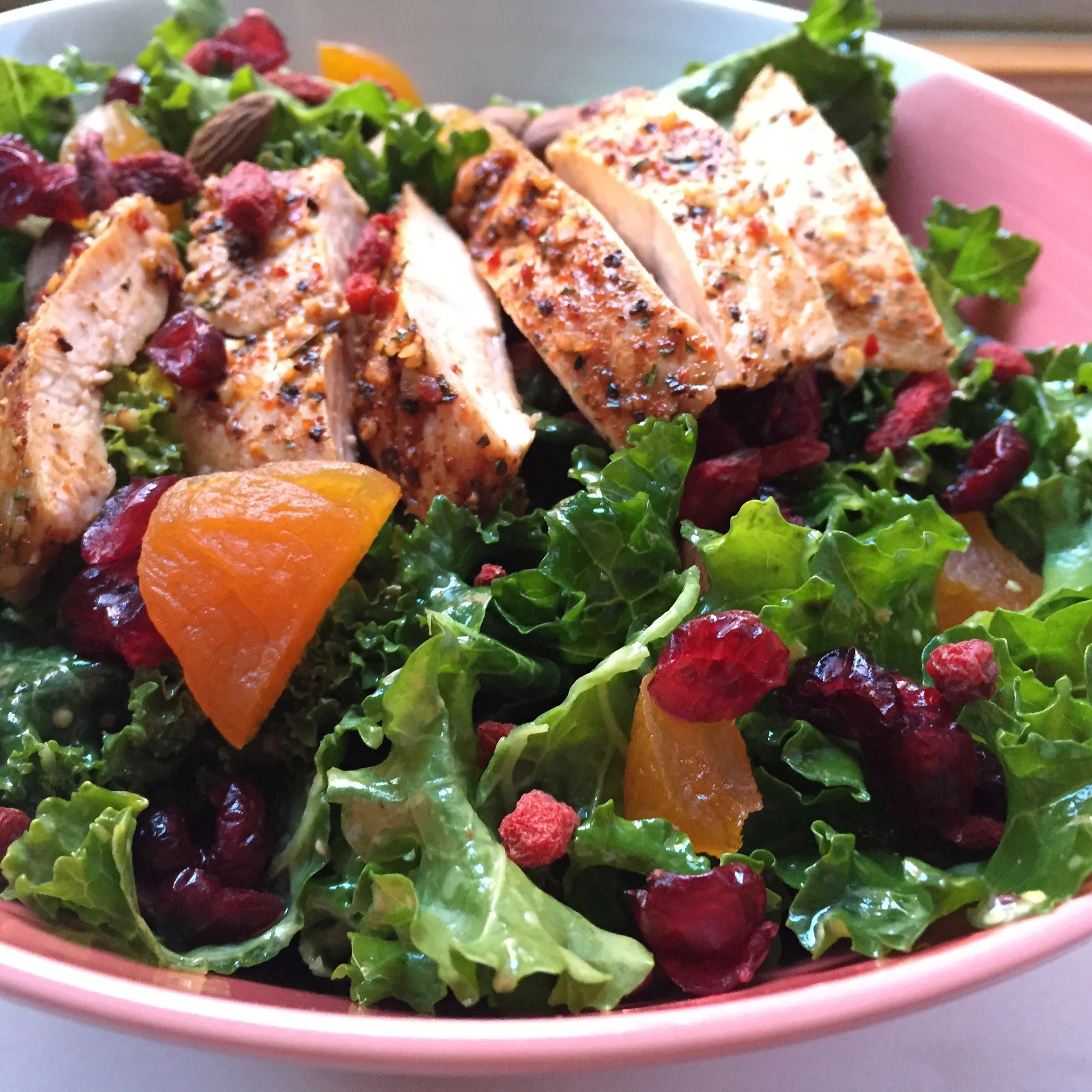 6. The kale lettuce is done! That's the best part about the salad, its just kale & dressing. Now, add whatever toppings you'd like. For us, we usually buy whatever is in season at the time (summer = berries vs fall & winter = squash). Like I said before, keep it healthy! That's the great thing about this salad, it tastes amazing with super healthy toppings.