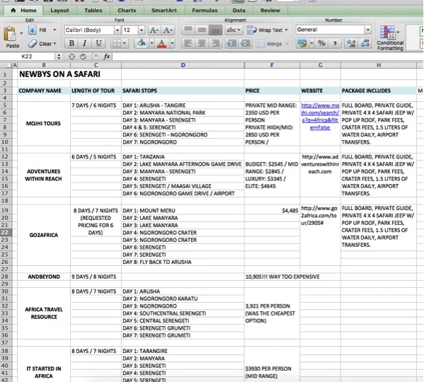 After months of emails back & forth with countless tour groups, we had decided on JorAfrica, and our decision was 100% based on the trust factor. Although there were others that sounded perfectly good, I always had this thought in the back of my mind of "what if they're a scam??". You have to pay in full before you arrive, and it was my worst nightmare that we'd land in Tanzania with no one there & thousands of dollars gone. JorAfrica was recommended to us by a coworker who personally used them two years ago and had nothing but spectacular things to say about them - so they were the best/safest option! (which by the way, we absolutely LOVED them as well).